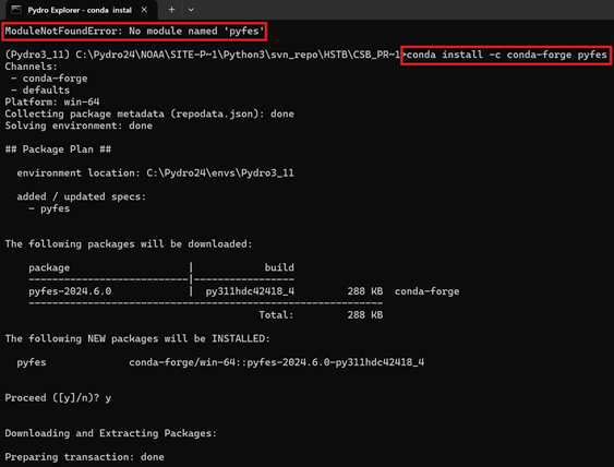 To resolve this error, enter the following line of code: conda install -c conda-forge pyfes